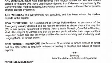 #announcement #COVID_19 اطلاع عام صوبائی حکومت کی ہدایات کی روشنی میں ضلع سوات بھرمیں کرونا وائرس ممکنہ پھیلاو کے سد باب کے پیش نظرمساجد میں با جماعت نماز پر پابندی لگادی ہے۔ اس لیے مسجد کے امام، موءذن اورمسجد خادم کے علاوہ کوئی بھی آدمی نماز ادا نہیں کریگا۔ ضروری اعلان پہ جماعتونو کے با […] More
